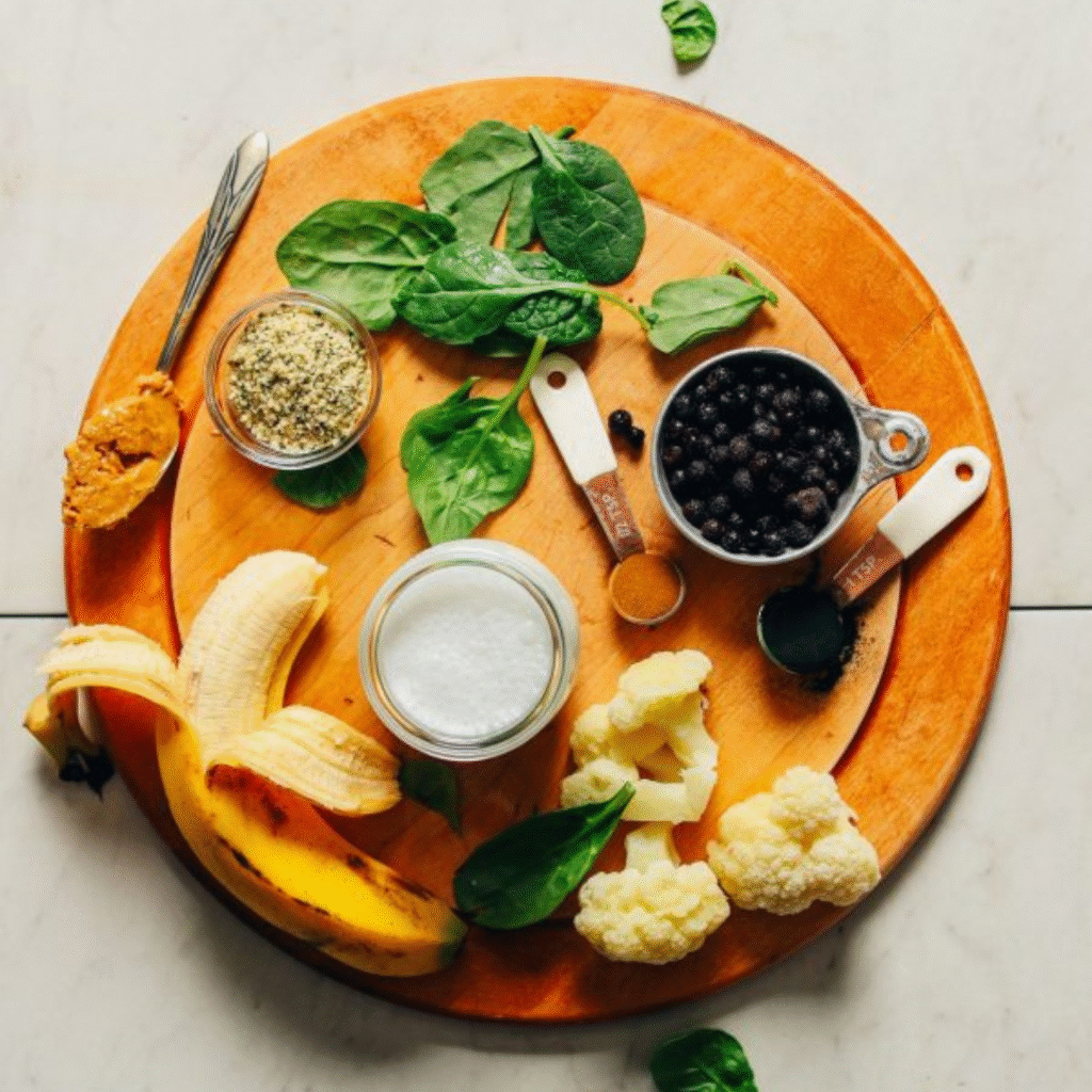 • Add all the ingredients (bananas, blueberries, spinach, cauliflower, dairy-free milk, maca, ashwagandha, Sea Glow Powder, hemp seeds, and peanut butter) to a high-speed blender.